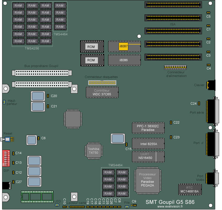 Amusant: La carte graphique couleur optionnelle était complémentaire à la carte d'affichage texte, ne se substituait pas à elle. Au final, le Goupil se retrouvait avec deux moniteurs connectés simultanément, chacun affichant ses propres données (graphique et texte).