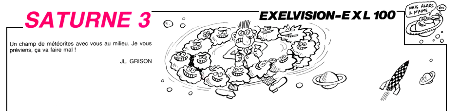 Note: L'EXL100 ne pouvant charger la totalité du programme en mémoire, SATURNE 3 est scindé en deux programmes «SATURNE0.BAS» et «SATURNE1.BAS». Le listing a été adapté pour une utilisation sur disquette. Exécutez le premier programme, la seconde partie se lancera automatiquement.