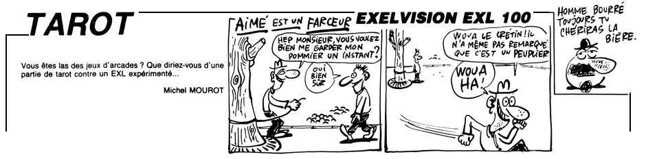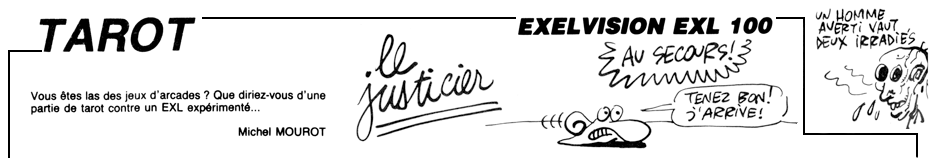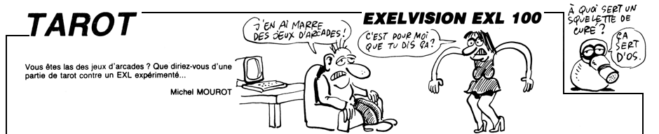 Note: L'EXL100 ne pouvant charger la totalité du programme en mémoire, Tarot est scindé en deux programmes «TAROT0.BAS» et «TAROT1.BAS». Le listing a été adapté pour une utilisation sur disquette. Exécutez le premier programme, la seconde partie se lancera automatiquement.
